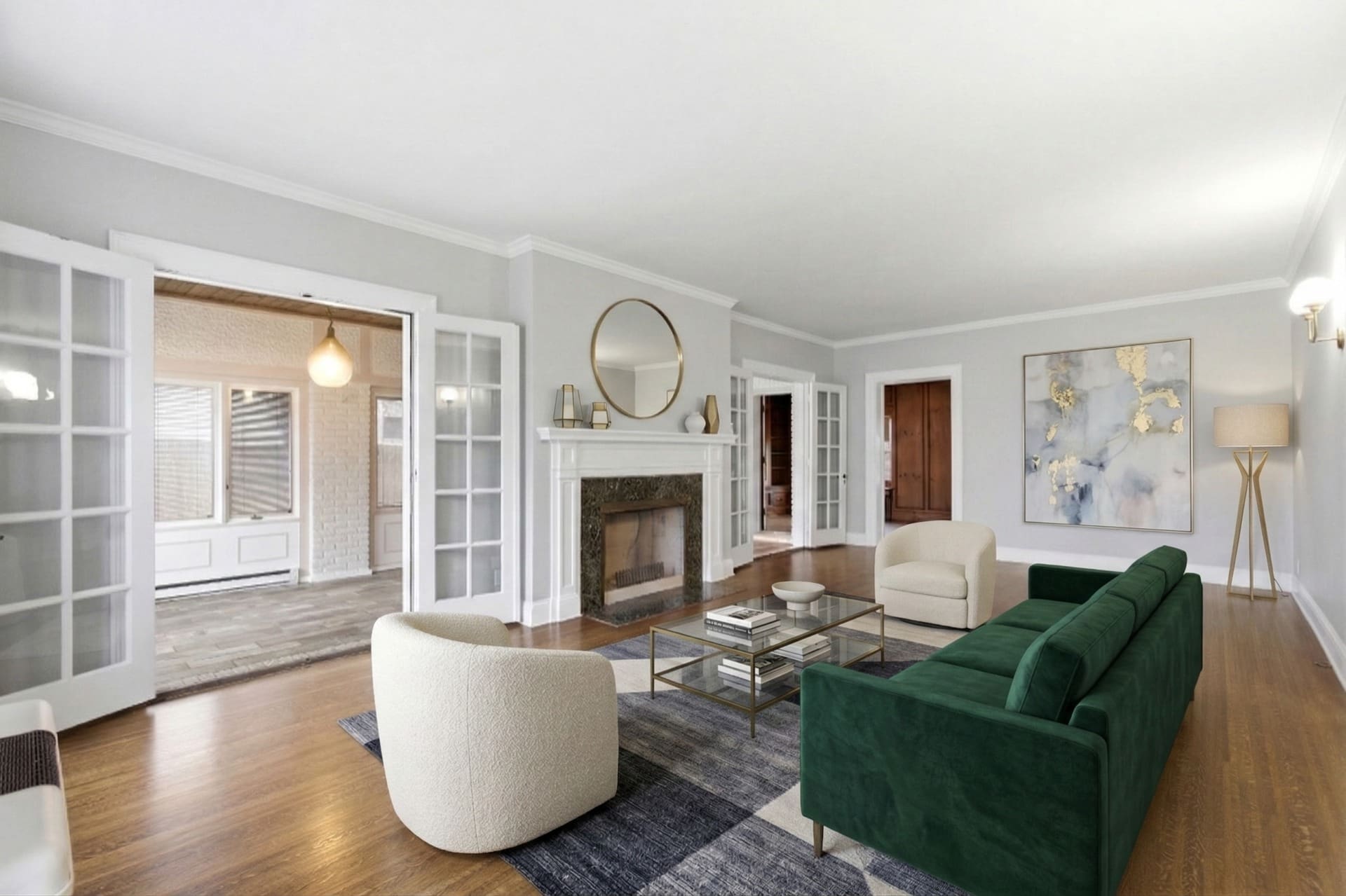 An expansive formal living room anchors the home with a woodburning fireplace and generous proportions that feel both grand and welcoming.