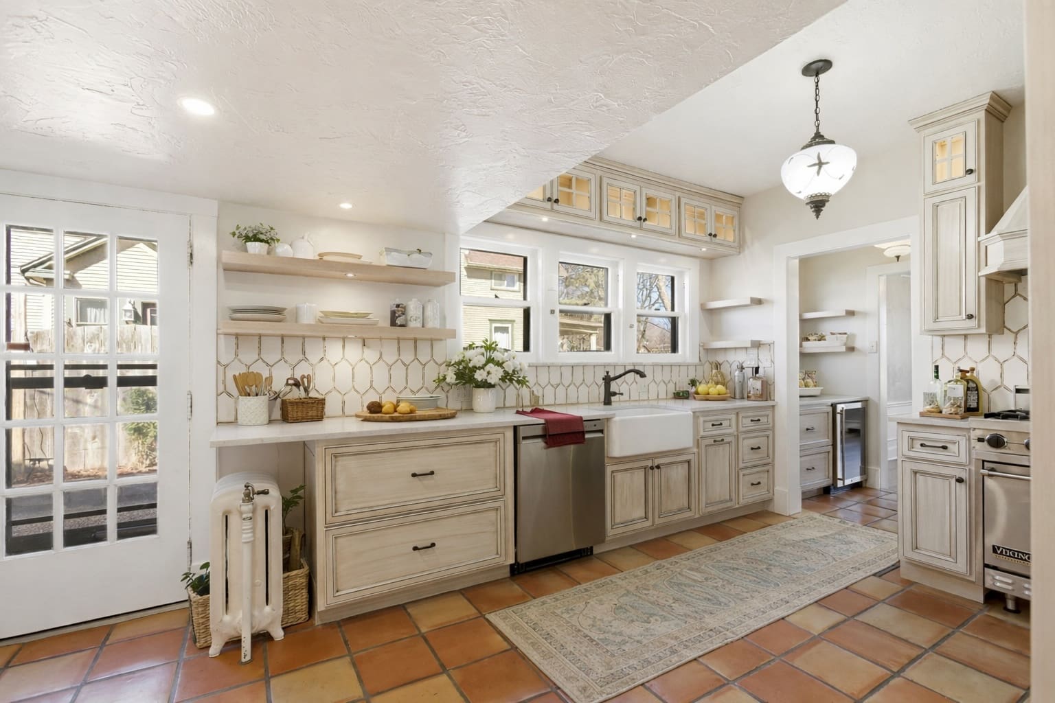 Just off the dining room, the fully remodeled chef’s kitchen showcases gleaming quartz countertops, a custom tile backsplash, high-end appliances and an abundance of cabinetry.