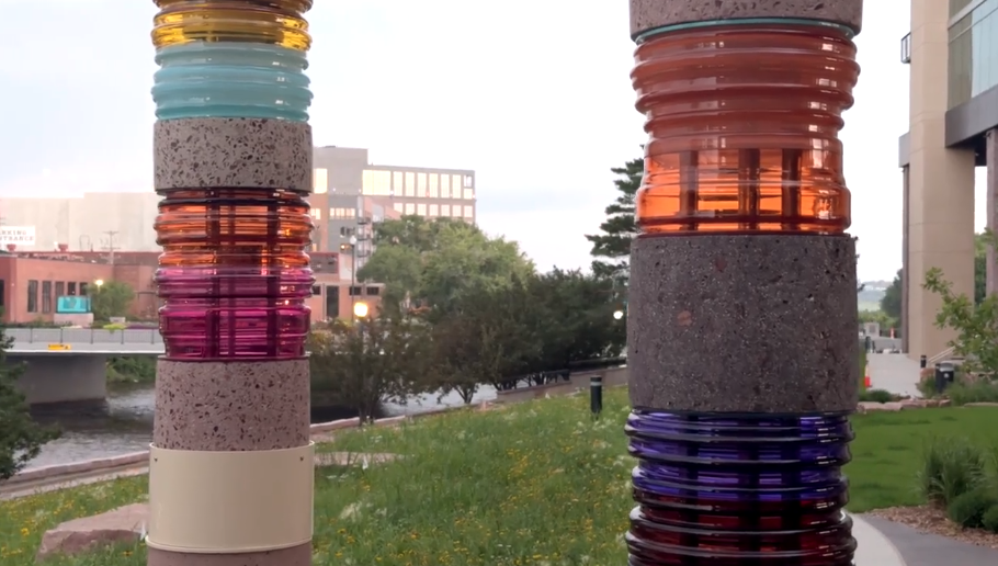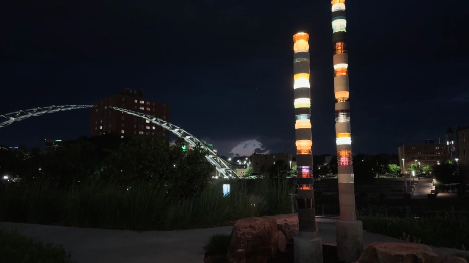 Color of Memory, a piece that consists of two lighted columns, is part of the riverfront at Cherapa. It’s by California artist Matt Gagnon, and the columns stand 14 and 11 feet, respectively.