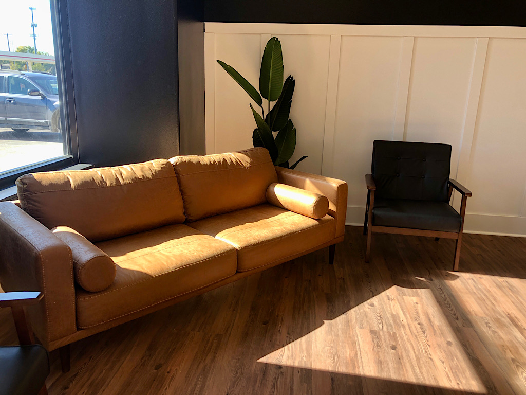 Her new home on 10th Street is a long space. She and Rerick remodeled it with white board and batten paneling with black walls above. The flooring is a wood tone. The south wall where the entrance is located is mostly glass, and Austin plans to add curtains.