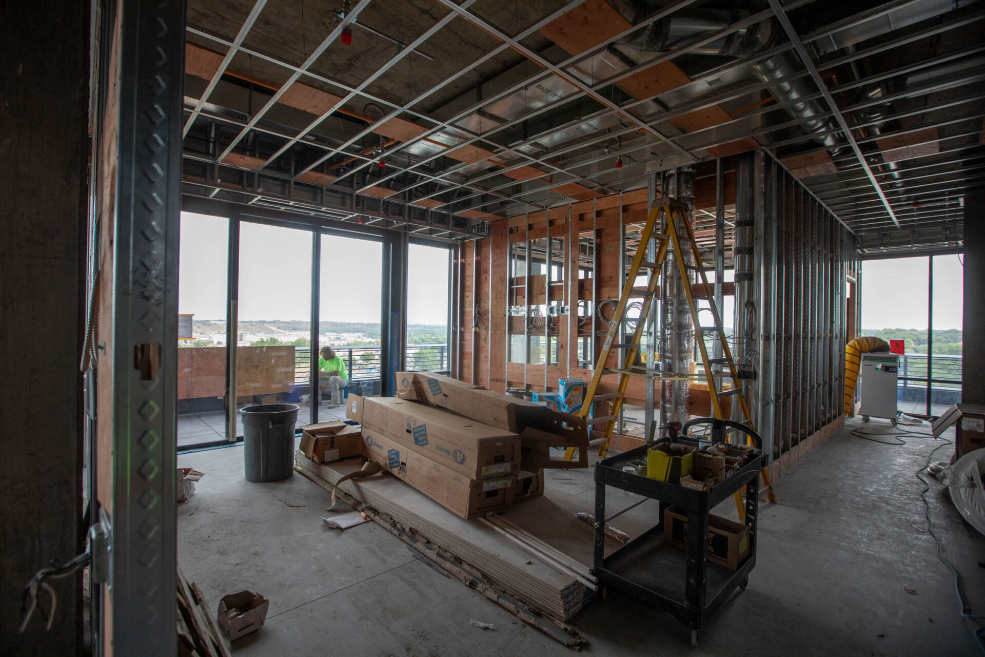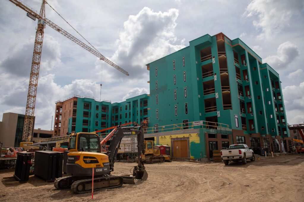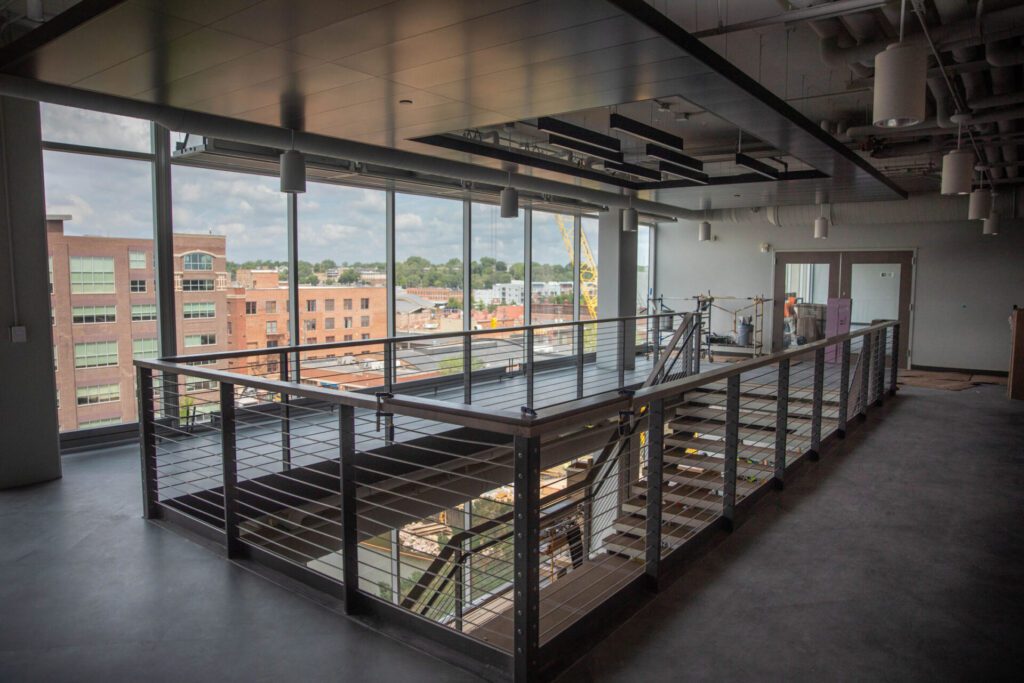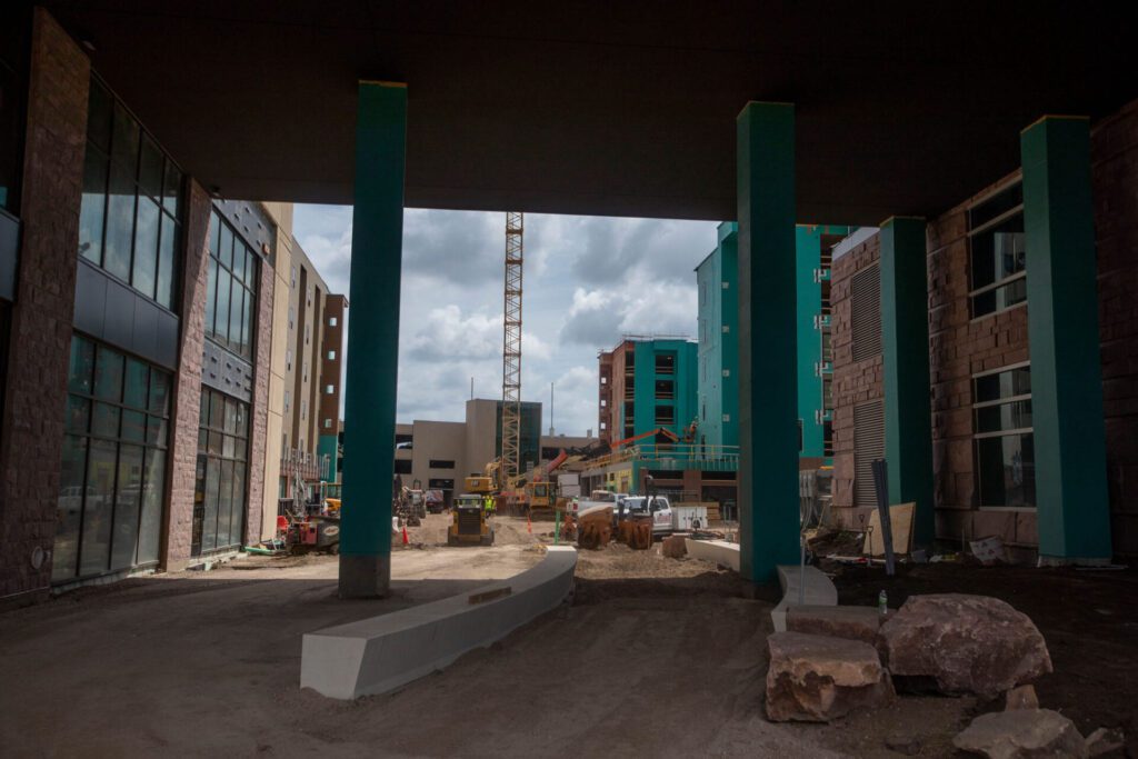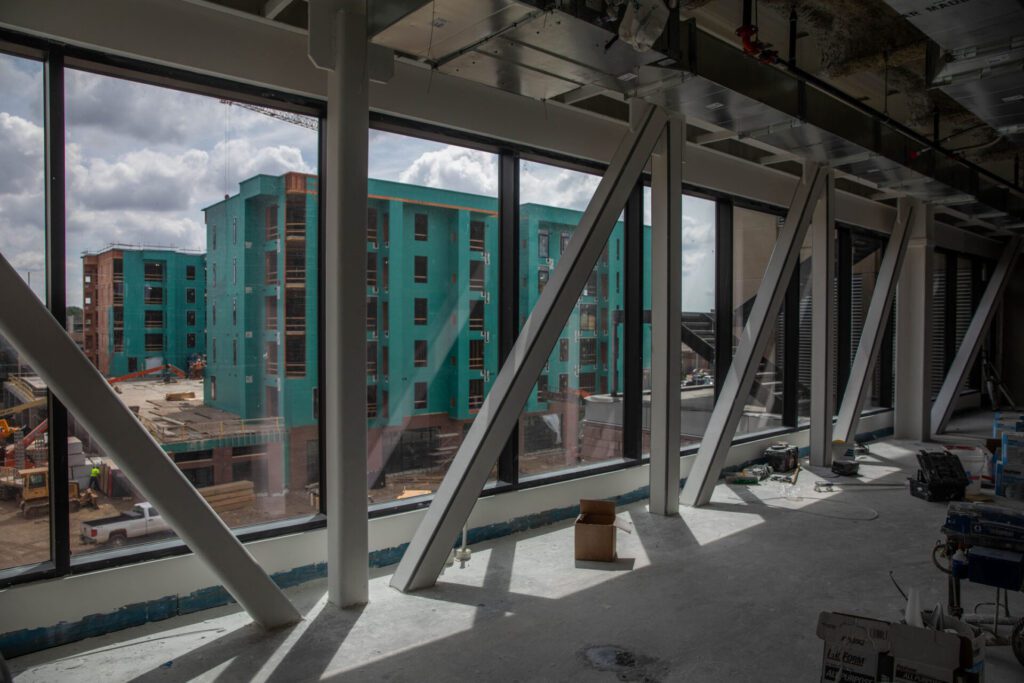 “We finished out the mass timber July 1, and so we’re complete with that in both buildings,” he said. “We’re starting to put in finishes — trim, doors, cabinets — and then in building four, we’re working on getting a roof on and getting the building enclosed over the next few months.”