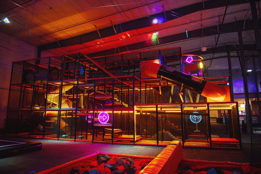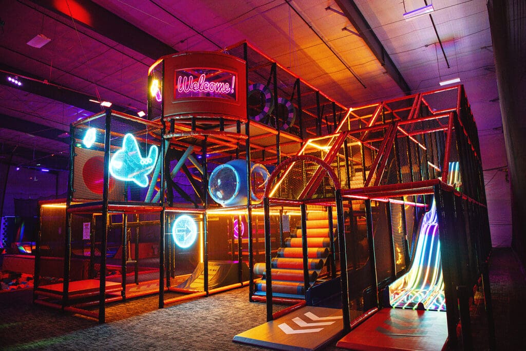 The adjacent Union Social offers more fun for all ages with regulation-size bowling lanes, axe-throwing and arcade games, with a prize redemption center. While Air Madness has a concessions stand with some food, Union Social features a restaurant and bar with a full liquor license.