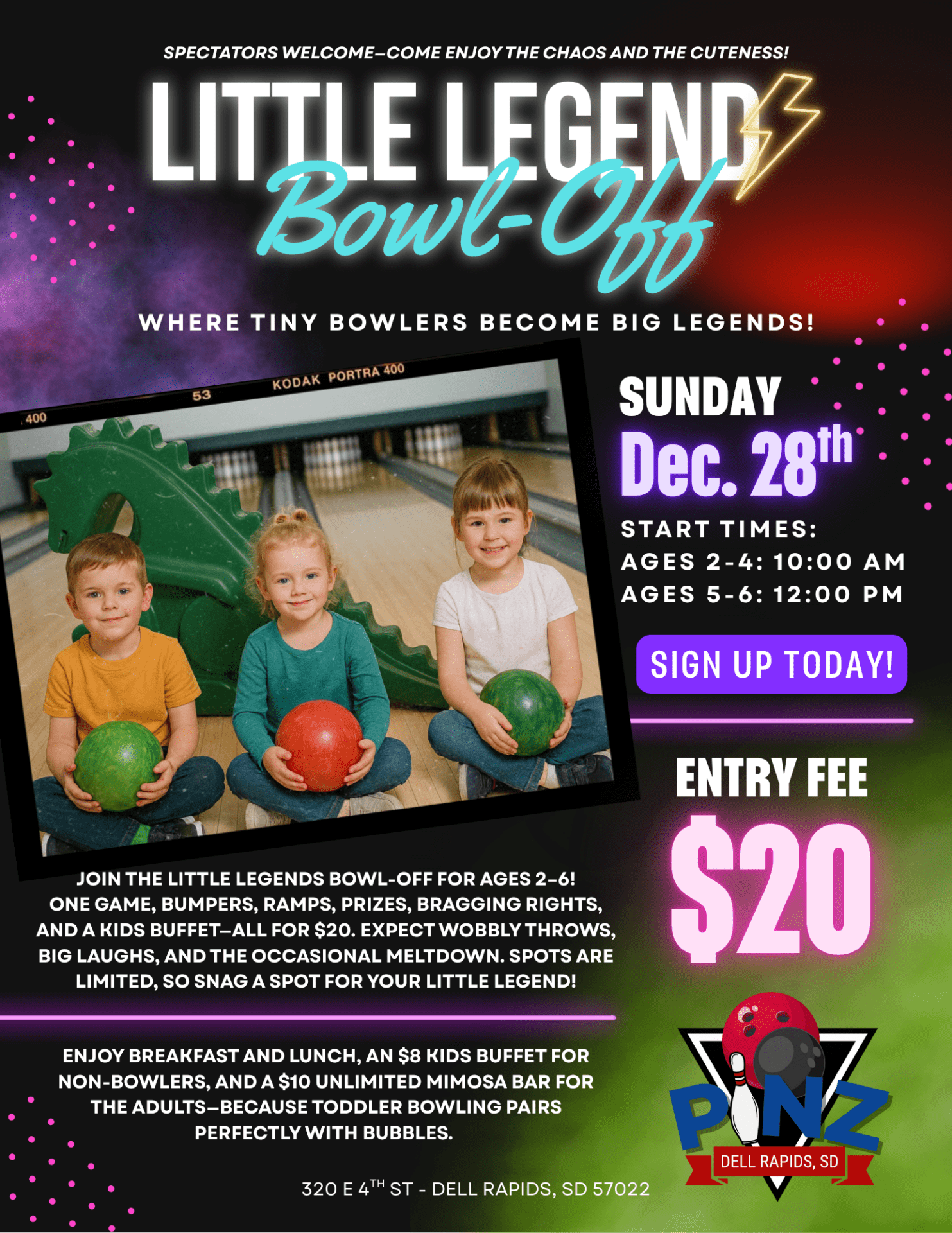 The Pinz bowling alley in Dell Rapids is organizing its first Little Legends Bowl-Off for kids age 2-6 on Sunday, Dec. 28.