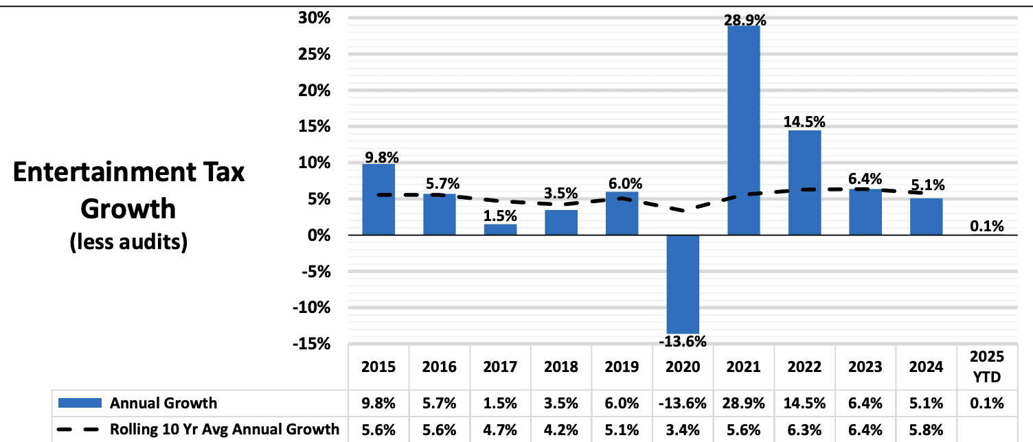 The entertainment tax also had a good month, up 7.2 percent to bring it flat for the year.