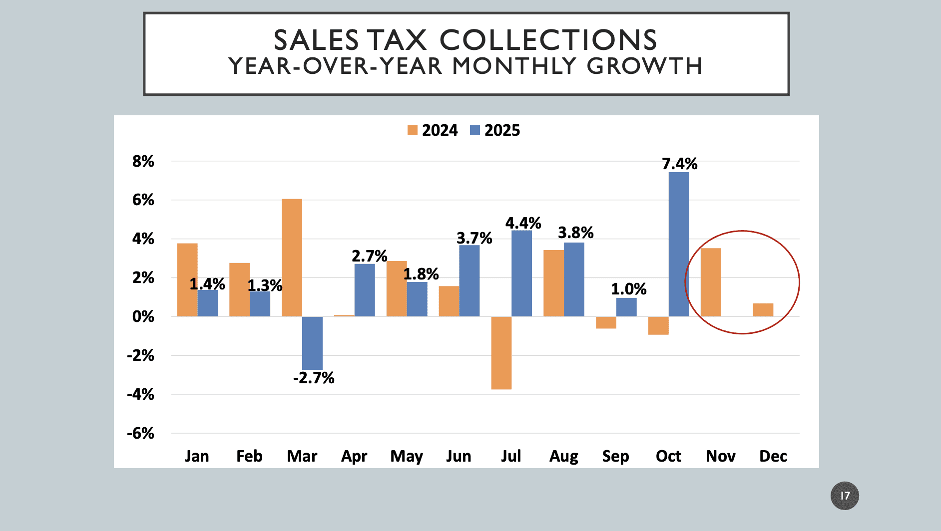 The city is tracking at 2.6 percent sales tax growth on a year-over-year basis, compared with ending last year up 1.5 percent.