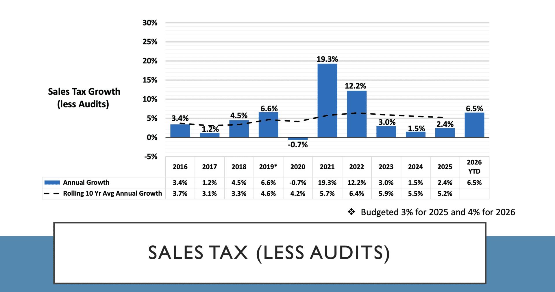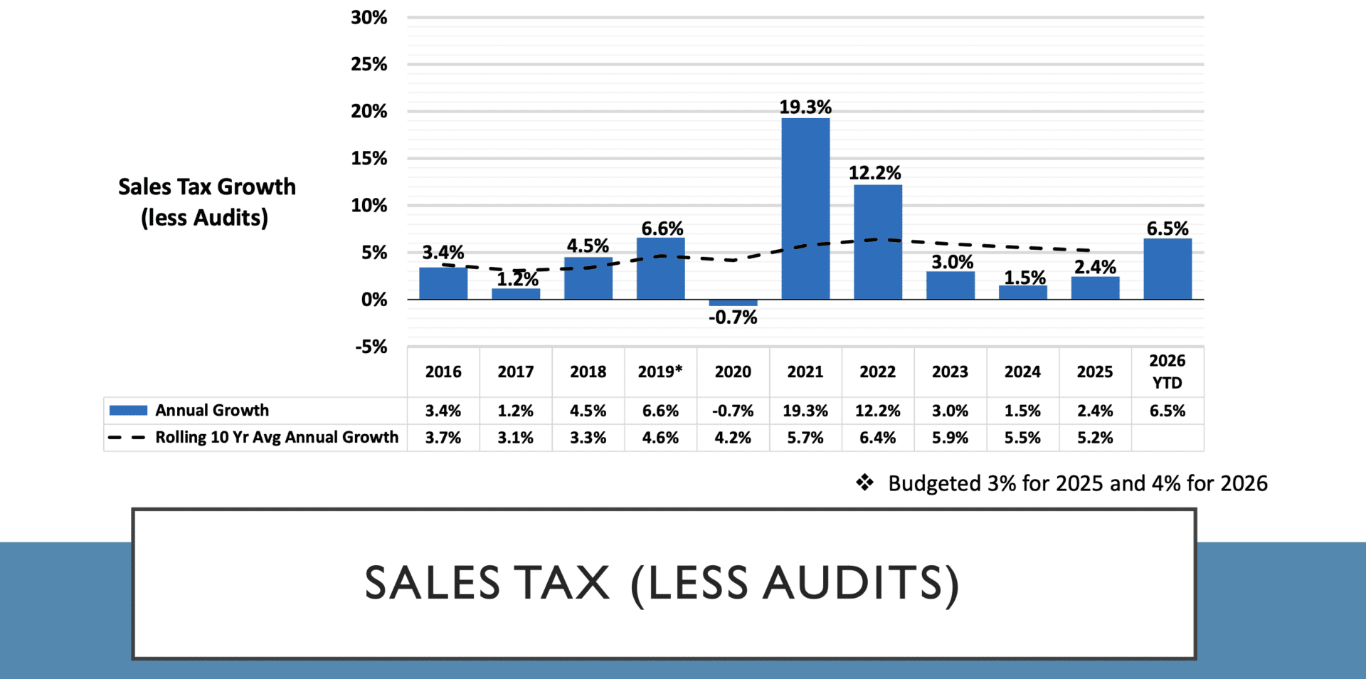 In 2025, sales tax revenue ultimately came in short $4 million, and overall revenue came in $1 million over budgeted expectations. That was driven by investment income and revenue from construction and liquor license-related fees.
