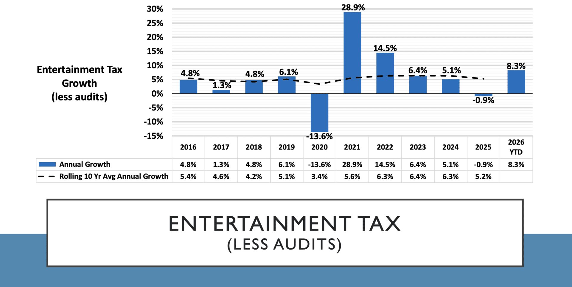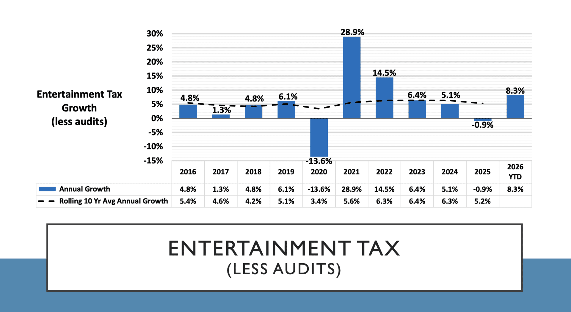 The entertainment tax year to date is up 8.3 percent, including a 44 percent increase in March versus being down 28 percent in March 2025 because of a state corrective action related to an entity that had overpaid in taxes.