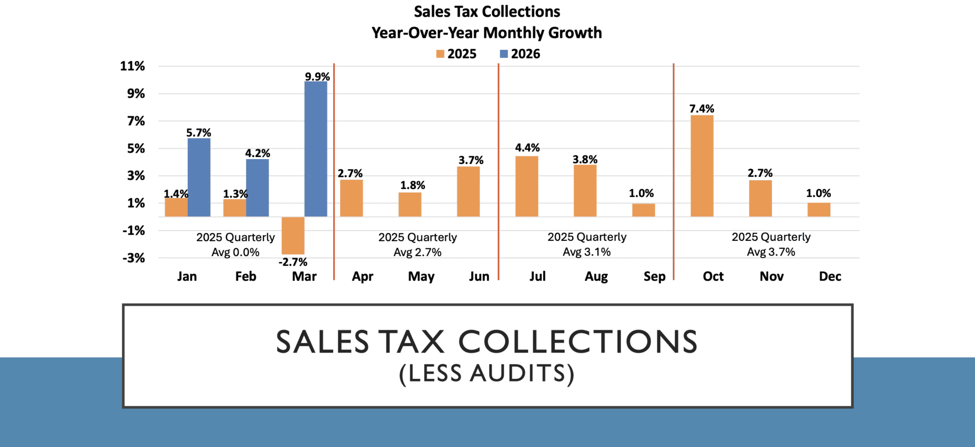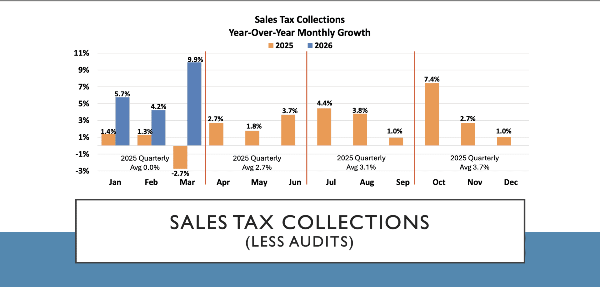 March’s revenue was up from negative 2.7 percent a year ago, “so we had an easier quarter to grow off of.” Through the first quarter, sales tax was up 6.5 percent.