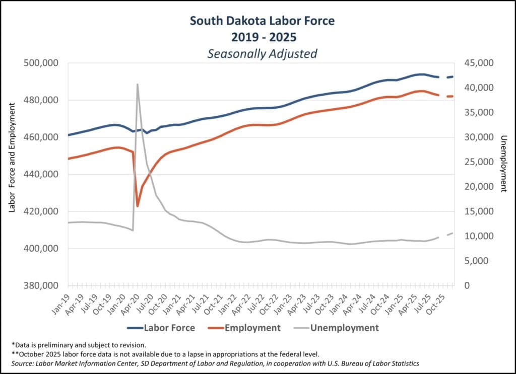 In December, South Dakota’s labor force was 492,600, an increase of 300 people from November. A year ago, it was 490,700.