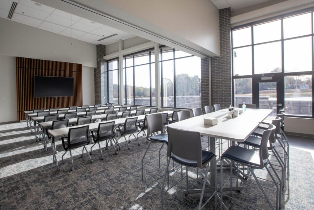 The work cafe is a combination break room and training room with a partition that can be used to divide it as needed.