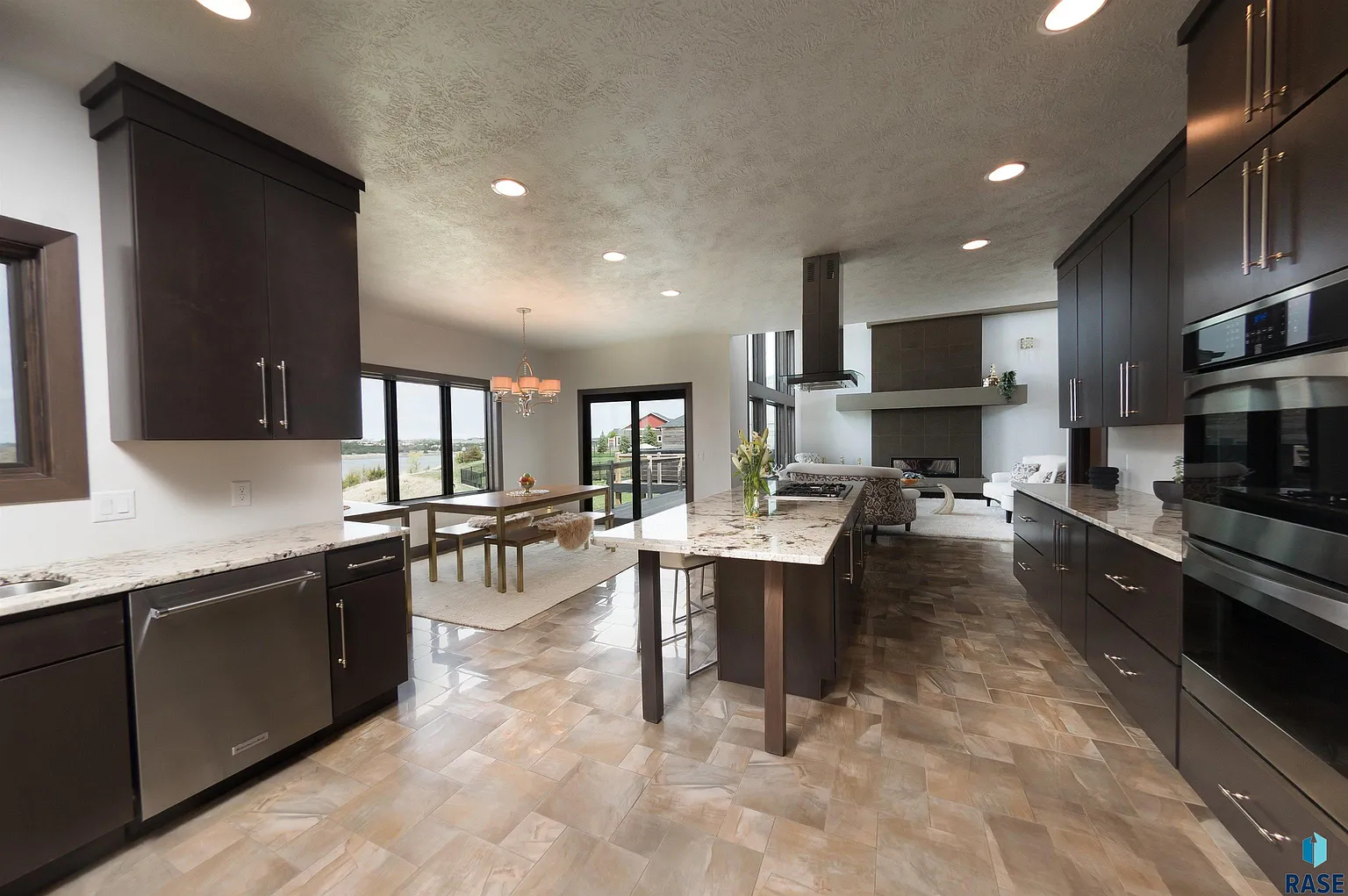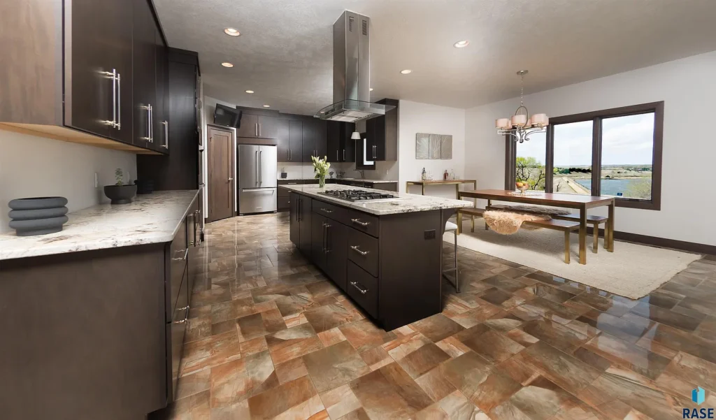 The standout kitchen offers a sleek design with a gigantic island, stainless steel appliances and striking tile floor.