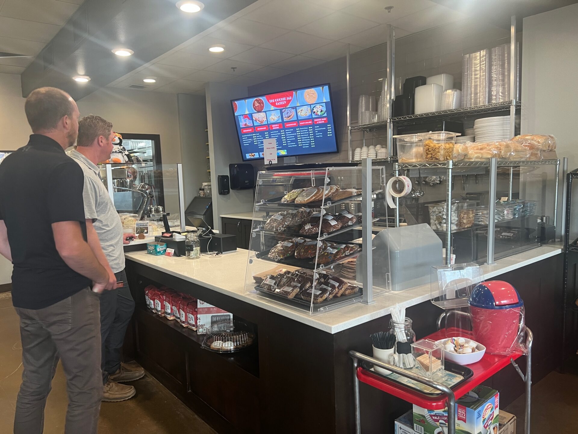 The breakfast menu includes the rolls, fruit, a breakfast sandwich and oatmeal and could expand on Saturdays with special offers. For lunch, there are soups, salads and sandwiches. The addition of a panini grill will allow for grilled cheese, turkey and ham paninis. The Cookie Jar also sells other to-go items such as bread, buns, granola and party mix.