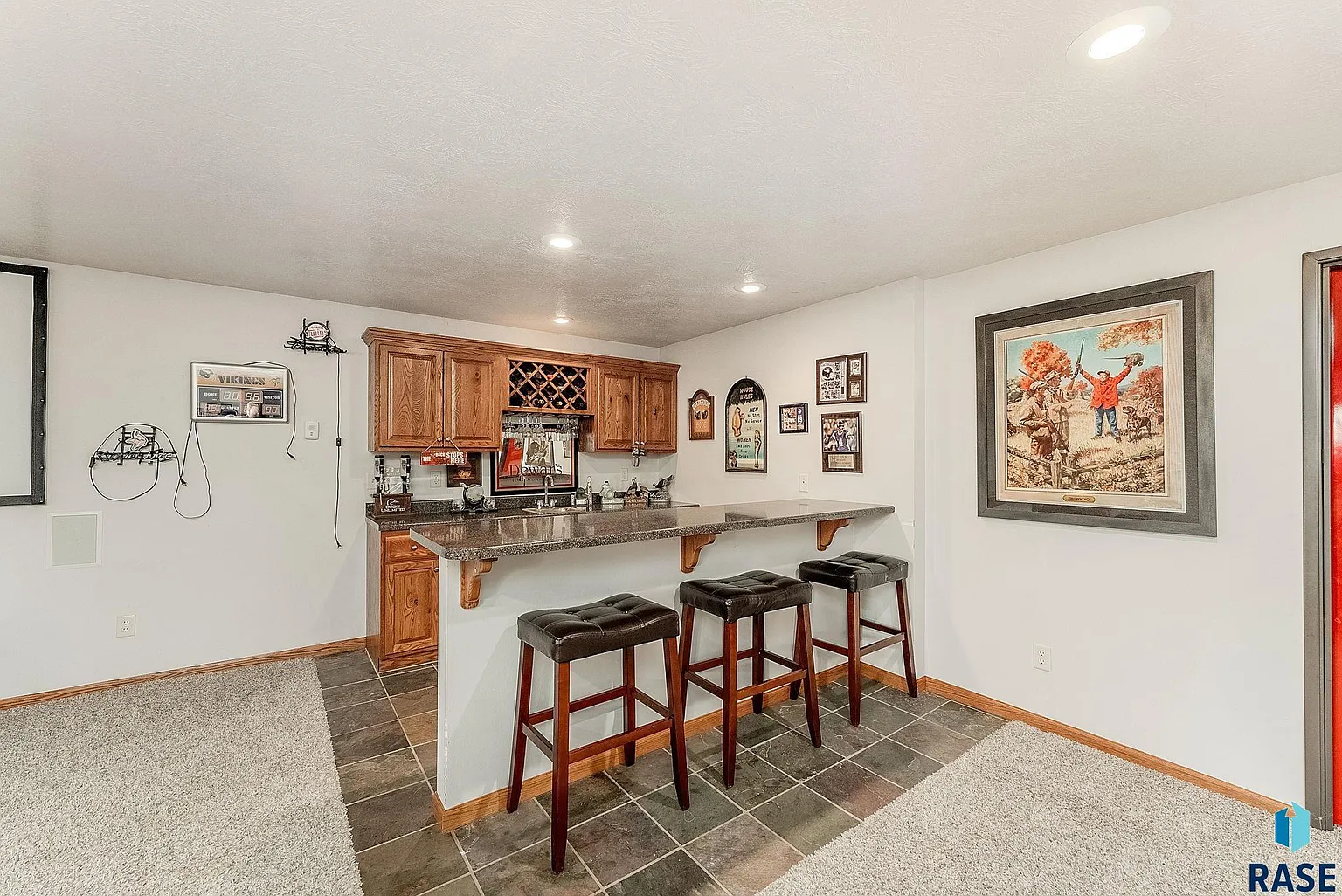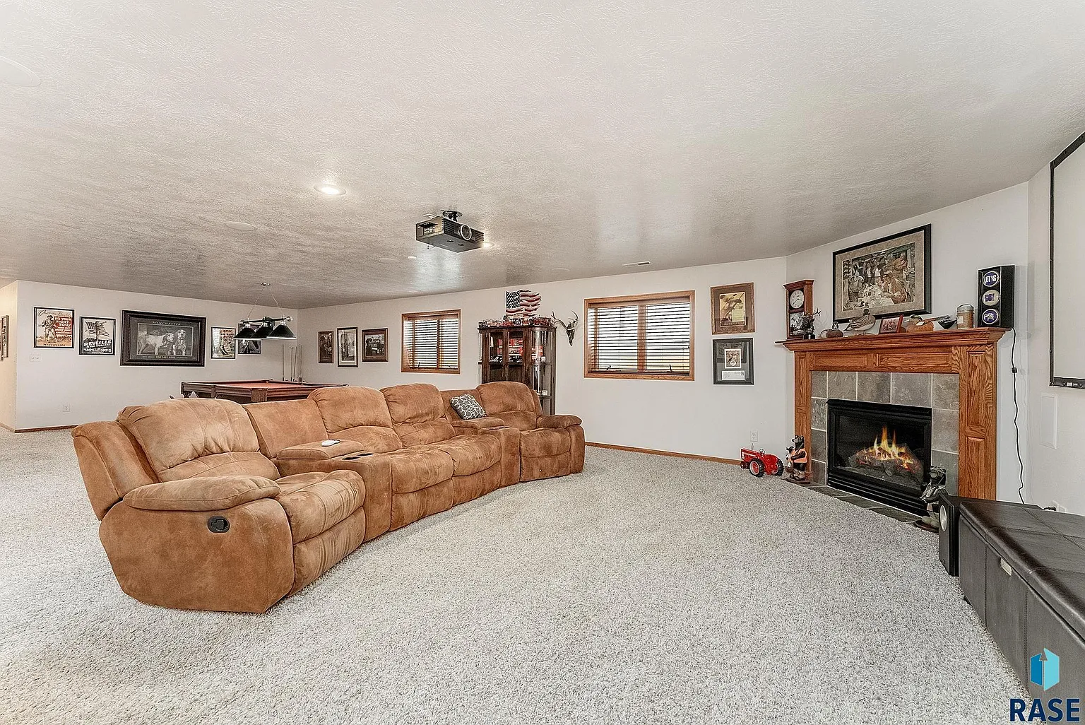 “Head downstairs to find an entertainer’s dream, with a fully equipped wet bar, pool table, built-in surround sound and a large-screen projector that make movie nights and game days unforgettable.”