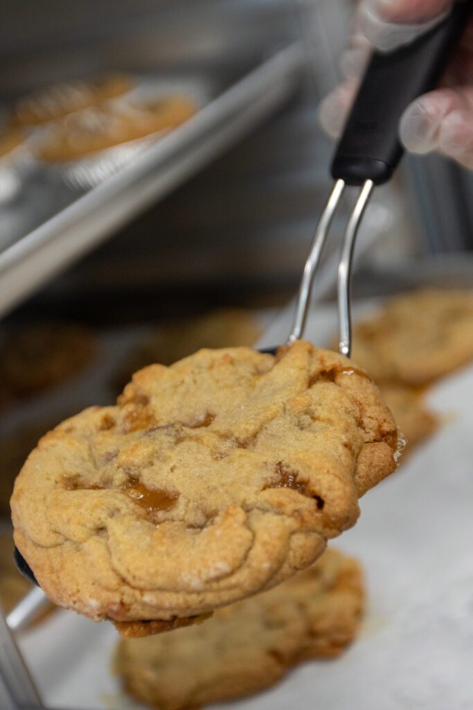 All cookies are prepared and baked on-site, and Crumbl does most of its own delivery. The menu includes single cookies, a four- or six-pack, a dozen and catering, which allows for a smaller cookie.