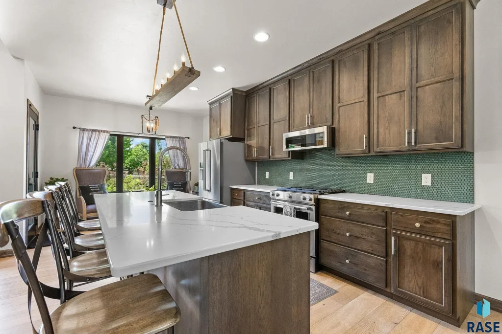 “This space features warm wood cabinetry, gleaming quartz countertops, a top-tier appliance package and a chic green tile backsplash,” Stockberger said.