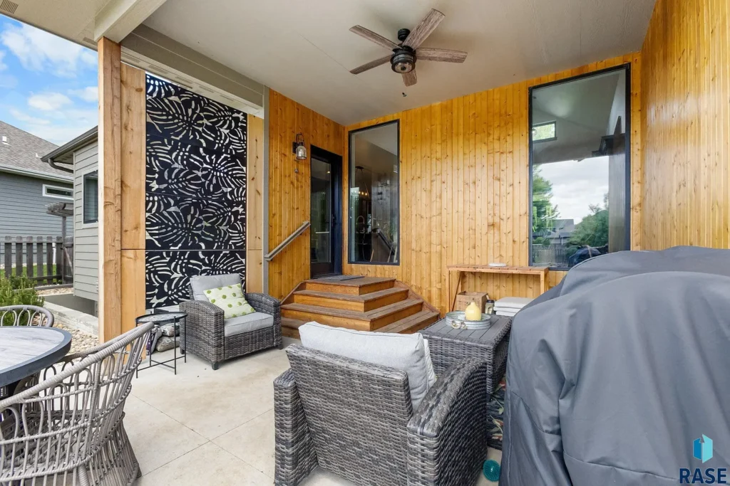 The home’s outdoor living is a professionally designed oasis, featuring a fully covered, ultraprivate patio framed with warm wood accents and stylish privacy paneling.