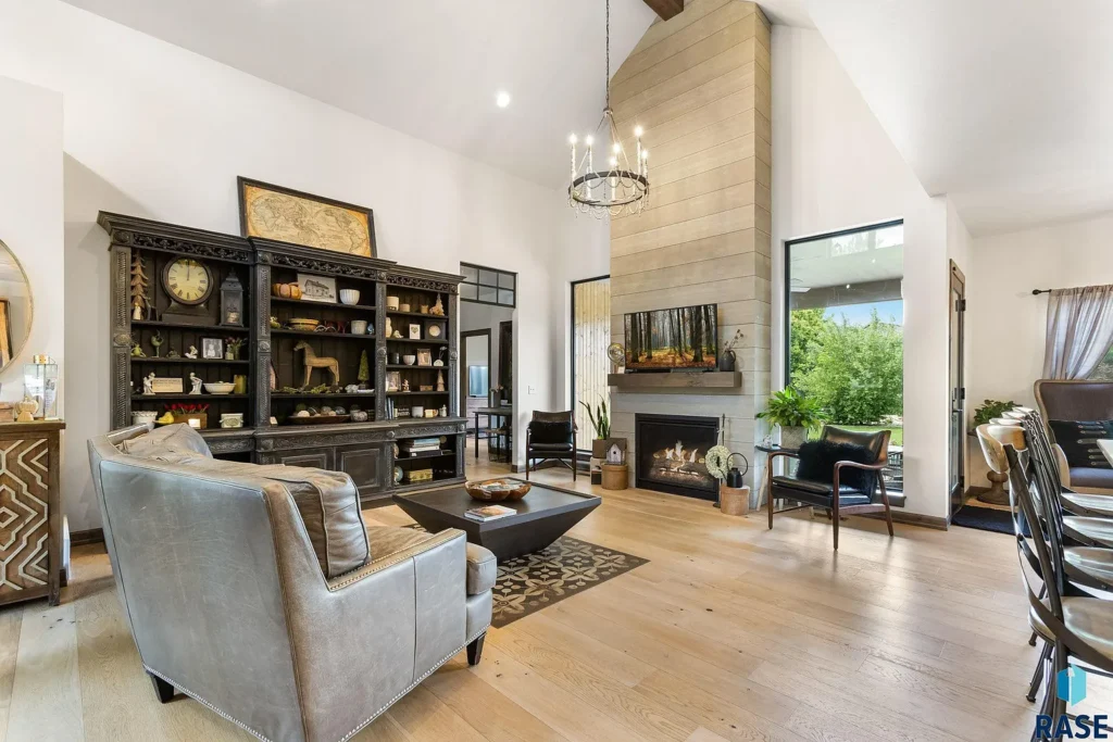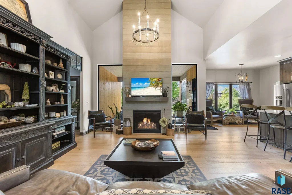 “The design is exceptional in this home, from the soaring ceilings to a dramatic floor-to-ceiling fireplace that serves as the focal point of the living room,” listing agent Amy Stockberger said.
