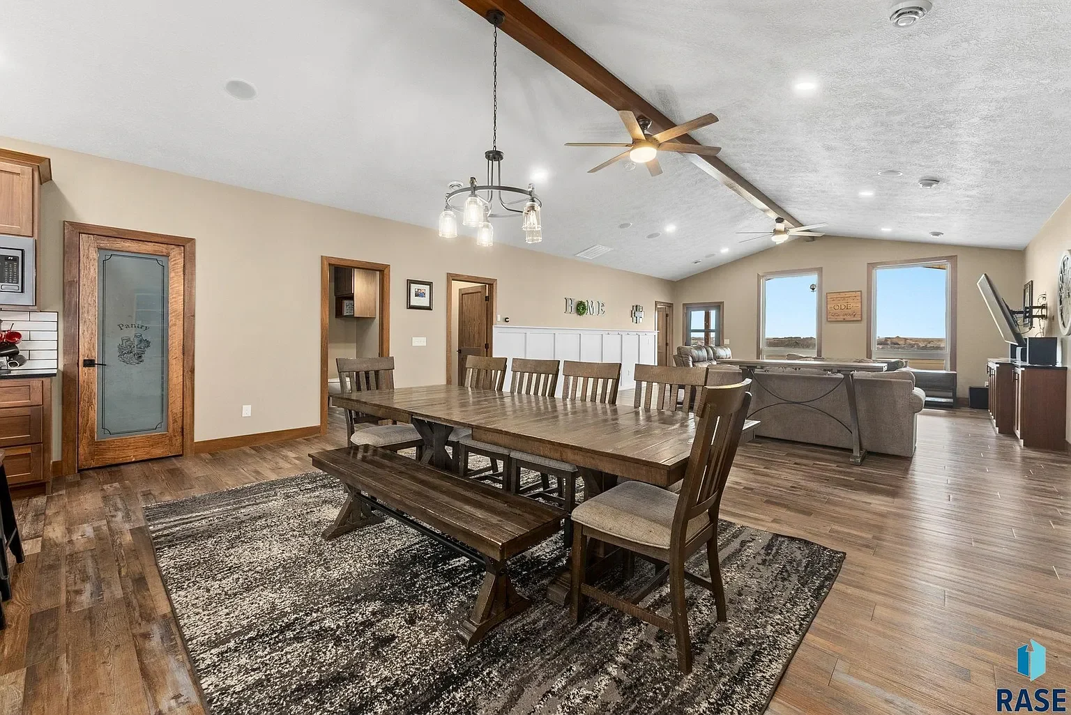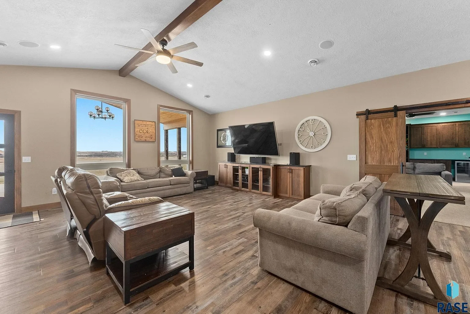 The open-concept design features 3,460 square feet all on one level, highlighted by vaulted ceilings with a wood beam accent, heated floors throughout and surround sound.