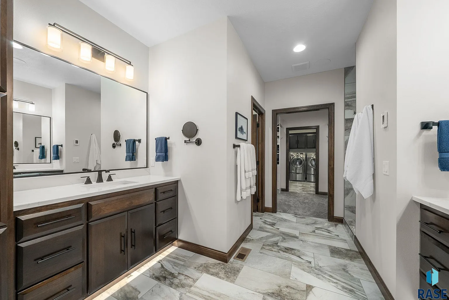 The grand primary suite includes a luxurious bath with double sinks, heated floors, a tiled shower and a separate water closet. For ultimate convenience, the oversized walk-in closet connects directly to the main-floor laundry.