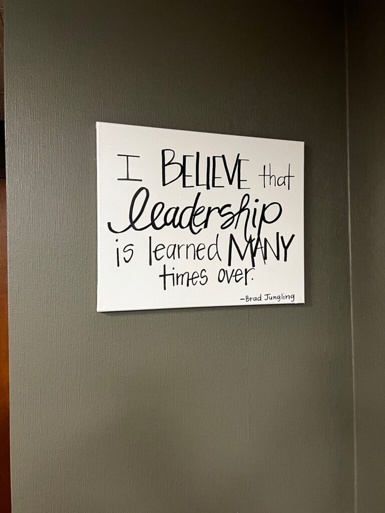 A fourth reads, “I believe that leadership is learned many times over,” noting that learners often create a group of learners. “I am a ferocious learner,” he said.