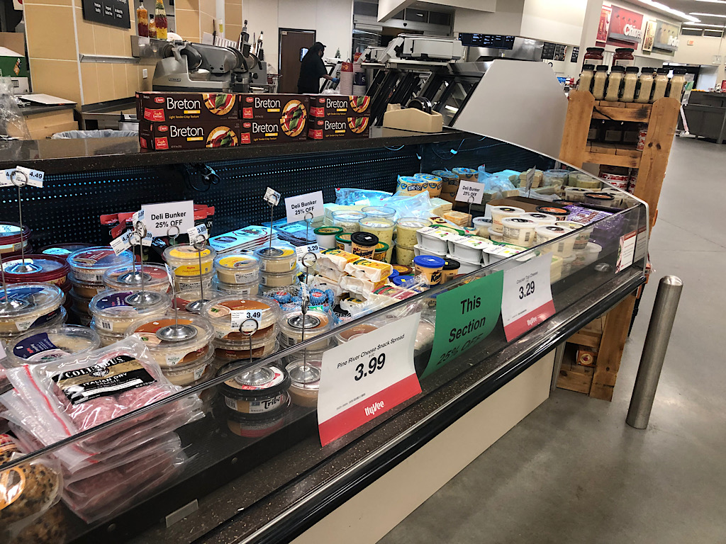 General grocery items are being sold at 20 percent off. Other categories range from 10 percent off fresh meat and 15 percent off dairy to 20 percent off wine and spirits, and 50 percent off health and beauty products. A small refrigerated case of hams is marked at 50 percent off in addition to the 10 percent discount for fresh meat.