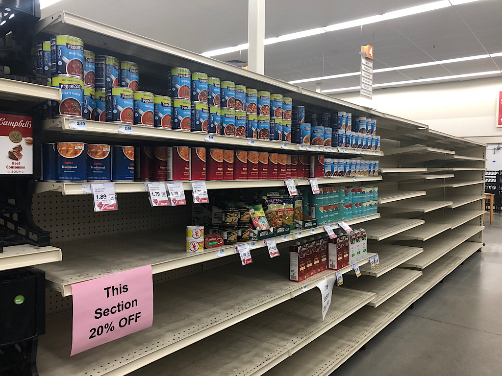The groceries that remain since discounted sales began have been moved to the ends of the aisles.