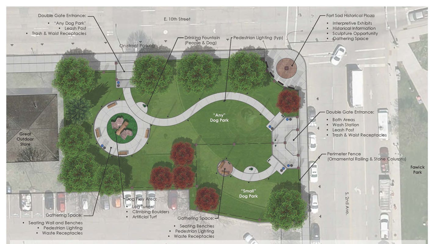 This rendering highlights the features of the Kirby Dog Park at Fort Sod, located at 10th Street and Second Avenue: