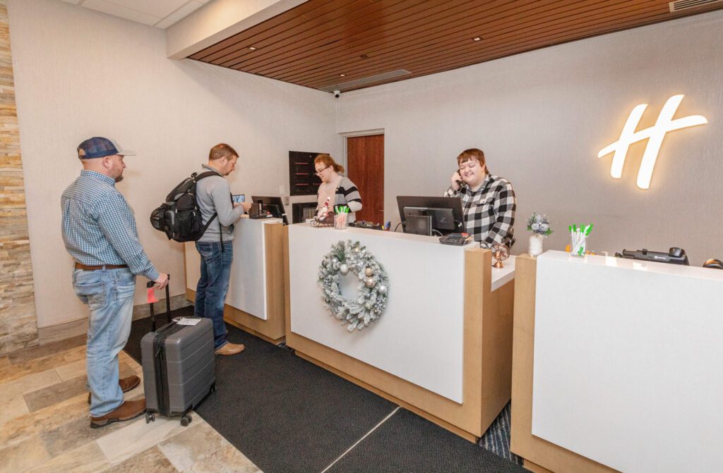 “We got rid of the big, bulky front desk and went to smaller pods,” Pravecek said. “It’s a little more open, a little more inviting. It’s not such a barrier between the front desk people and the guests.”