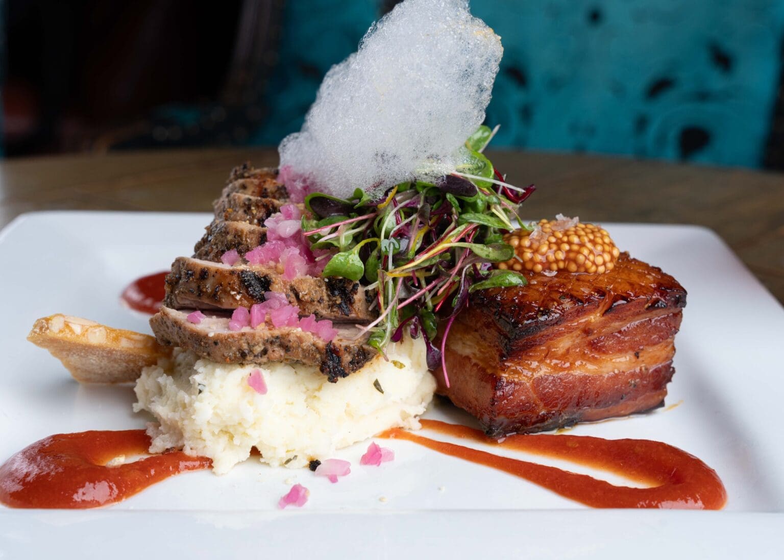 The winning dish, called Bavarian Echoes, is described as “crisp-edged pork belly glazed in hot honey alongside charred pork tenderloin, set over truffled potato puree. Autumn herbs and a spiced vinaigrette weave brightness through layers of tomato jam, mustard caviar and pickled onion relish. Finished with pretzel crumb and almond brittle for a Bavarian nod.”