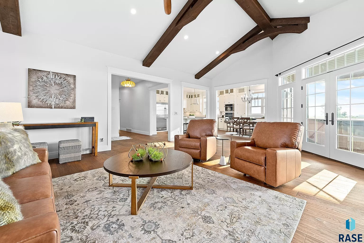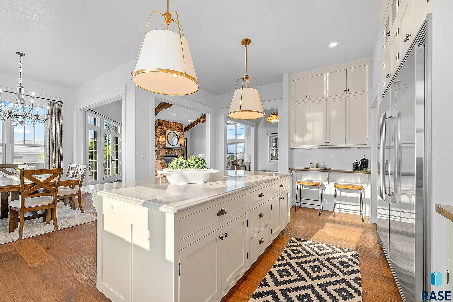 A custom stone fireplace, custom wood beams and large windows create a destination great room that easily flows to the kitchen and dining room.