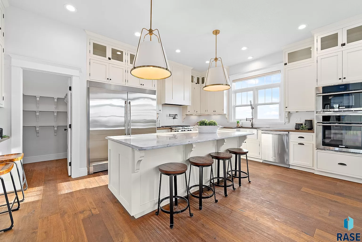 The kitchen is a showstopper and features a walk-in pantry, huge island, wood counters, top-of-the-line appliances and tons of beautiful cabinetry.