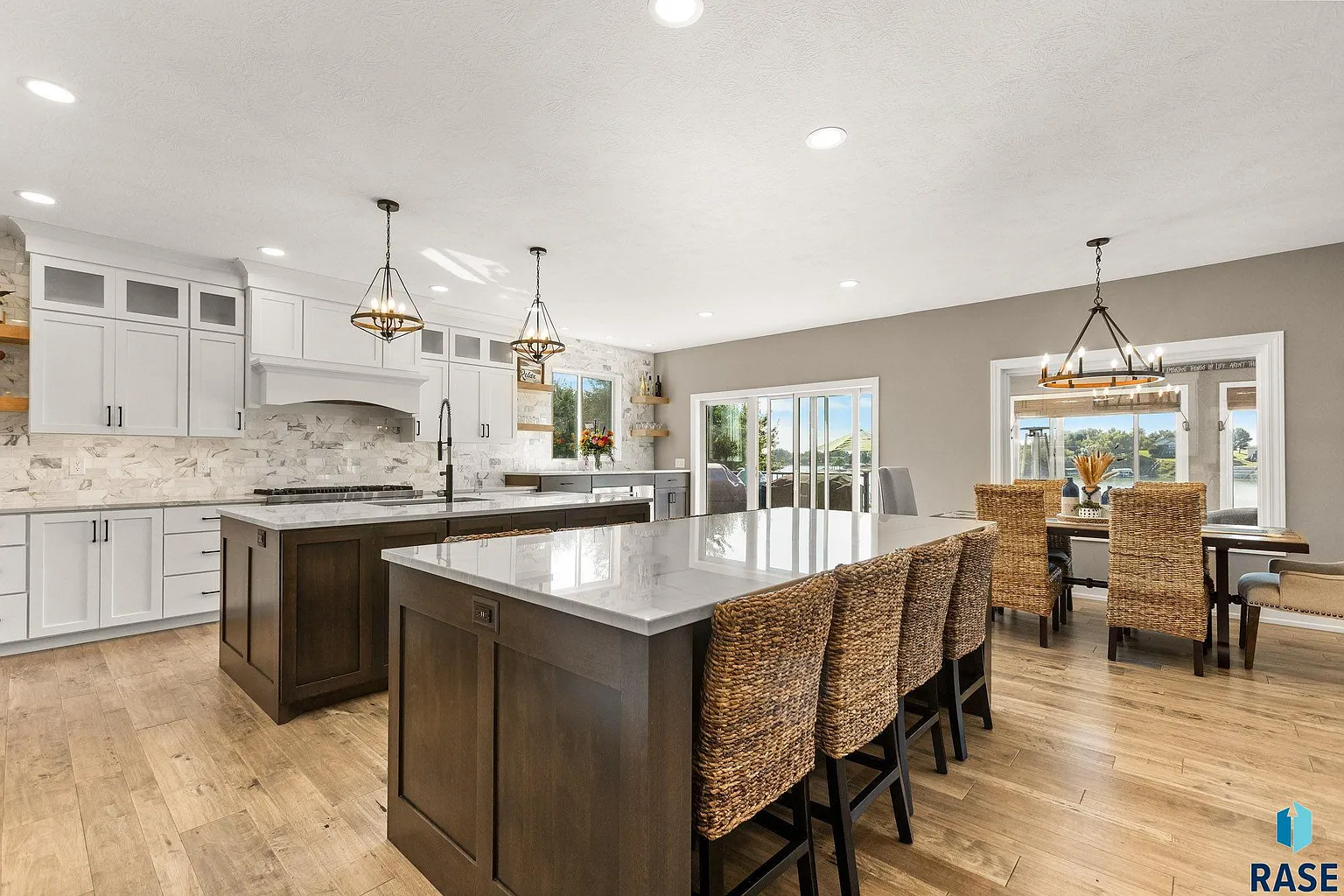 Inside, the recently modernized gourmet kitchen shines with coveted double islands, quartzite counters, JennAir appliances and a beverage fridge — perfect for lakeside hosting.