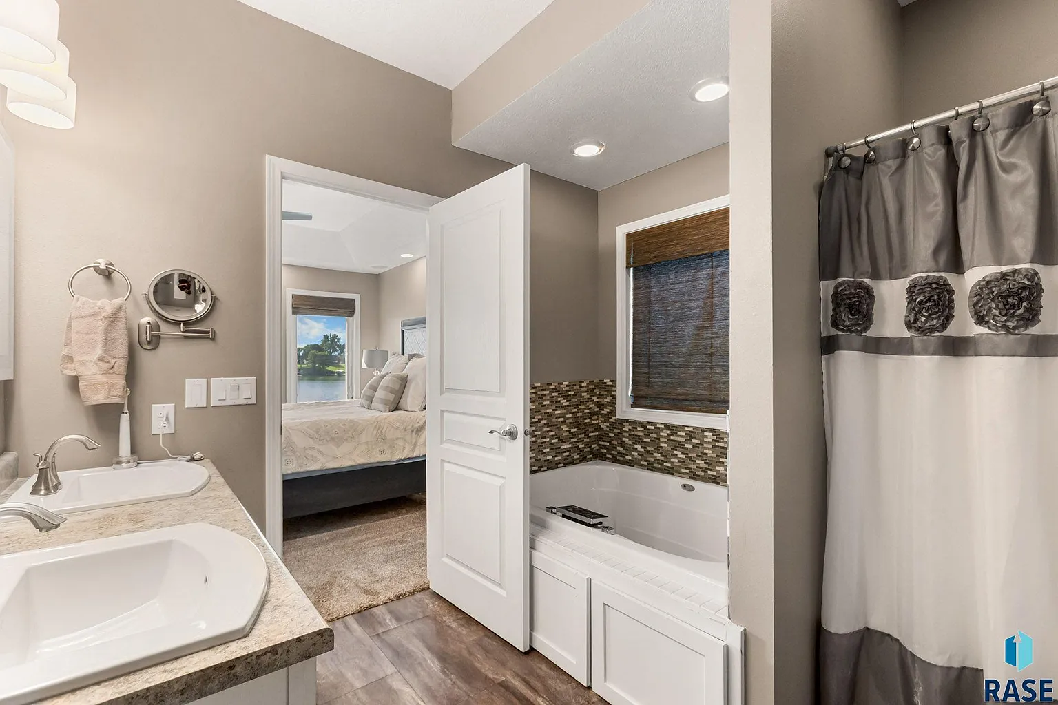 The primary suite features an inviting master bath, including a double vanity, walk-in shower and soaking tub.