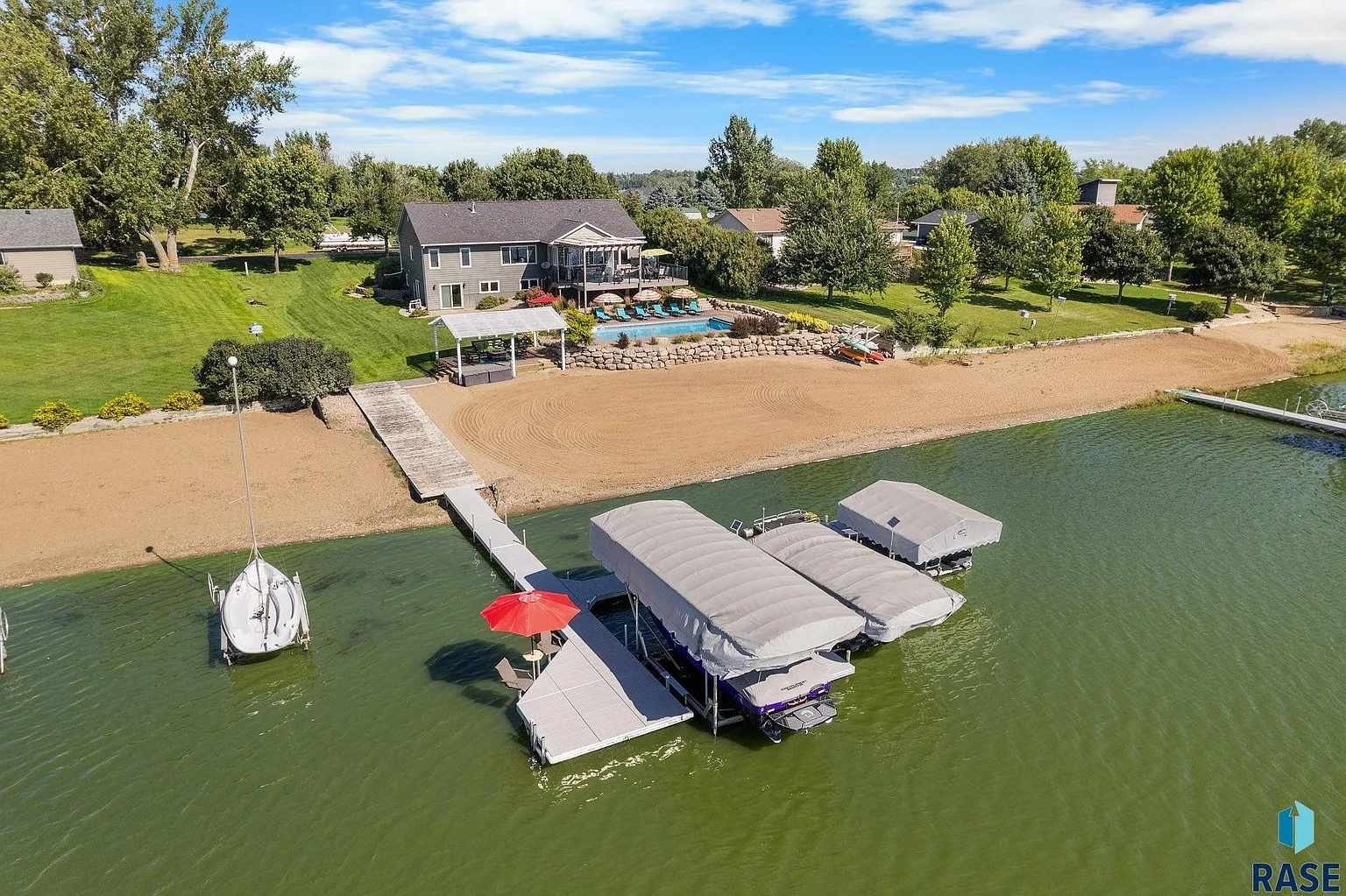 Located in the coveted Harbor community at 6328 Harbor Way, this stunning six-bedroom, three-bath ranch walkout home features almost 88 feet of pristine sandy shoreline.