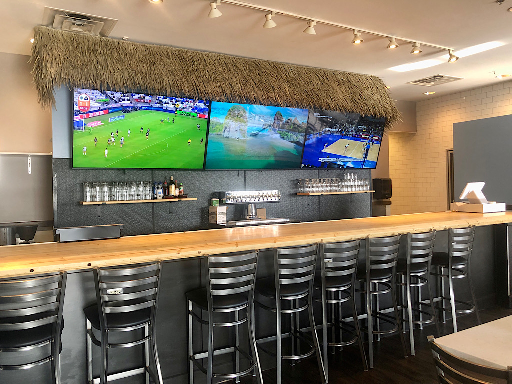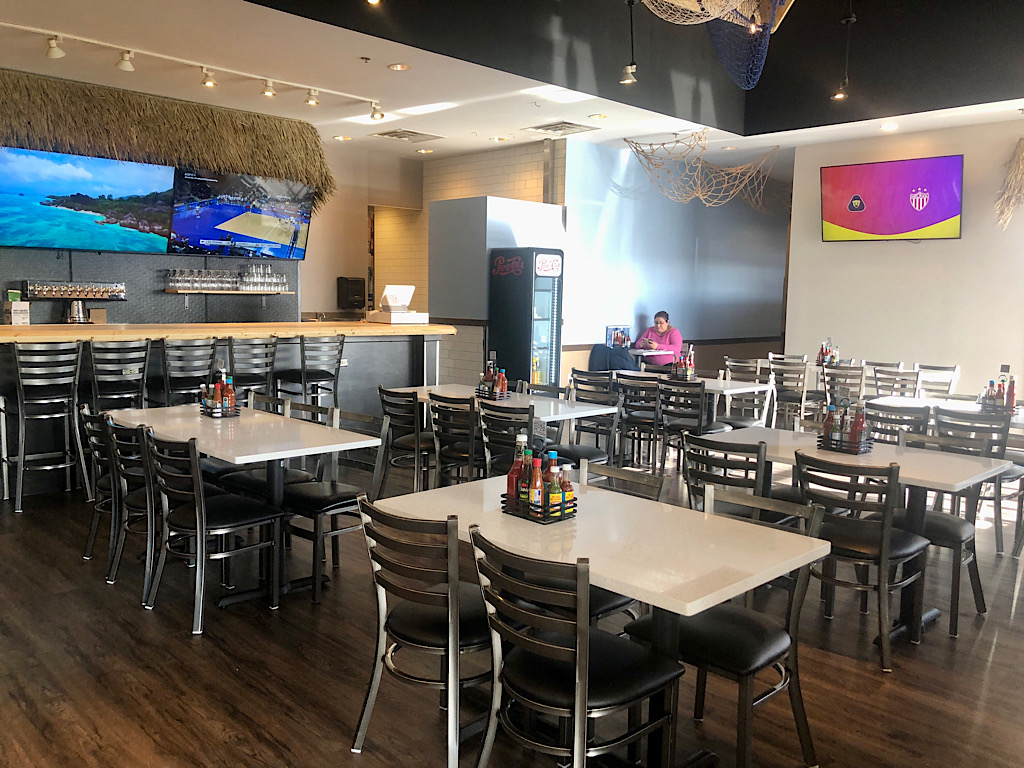 The decor inside the restaurant, which seats just over 100 diners at tables and a few booths, has a beach vibe with a thatched “roof” above the bar, fishing boat suspended from the ceiling and a surfboard on the wall.