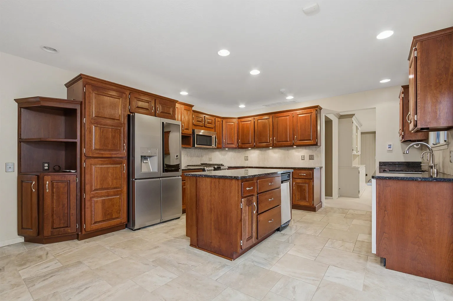 The kitchen features a center island, granite counters and abundant cabinetry.