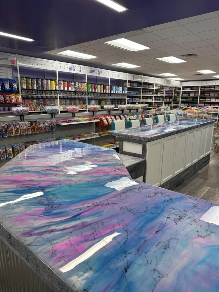 While most of the space in Sweet Amber Lynn’s is filled with bags, boxes, tubs and containers of candy and shelves lined with bottles of pop, there’s a soda shop counter with two-toned teal and gleaming chrome stools. The vibrant epoxy countertop with shades of pink and blue was custom-made by Brian Siedschlag of Brian’s Custom Counters in Hartford.