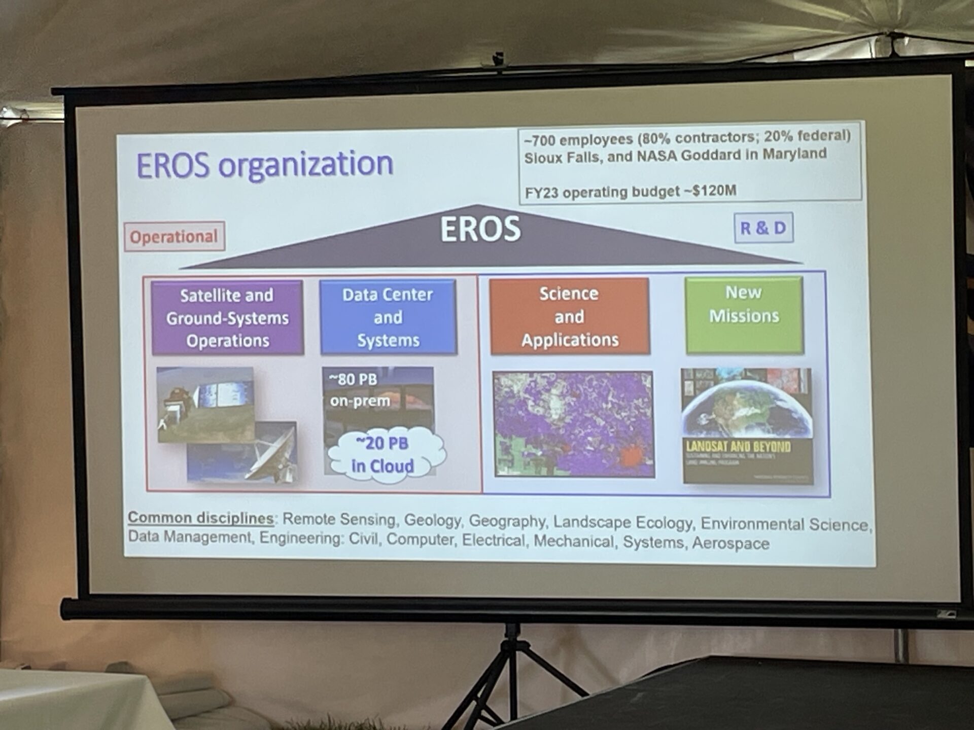 EROS and its operations similarly have had significant impacts on the local economy. With 600 employees working out of its rural Sioux Falls site, EROS has operated with a $120 million operating budget in fiscal 2023. Forty years earlier, in 1983, then-director Al Watkins estimated a total local payroll of roughly $10 million annually. With yearly expenditures of $2 million for supplies and utilities back then and approximately $2 million in spending by roughly 3,000 to 5,000 visitors to EROS each year, he estimated the rollover impact of those dollars in the local economy to be $42 million.