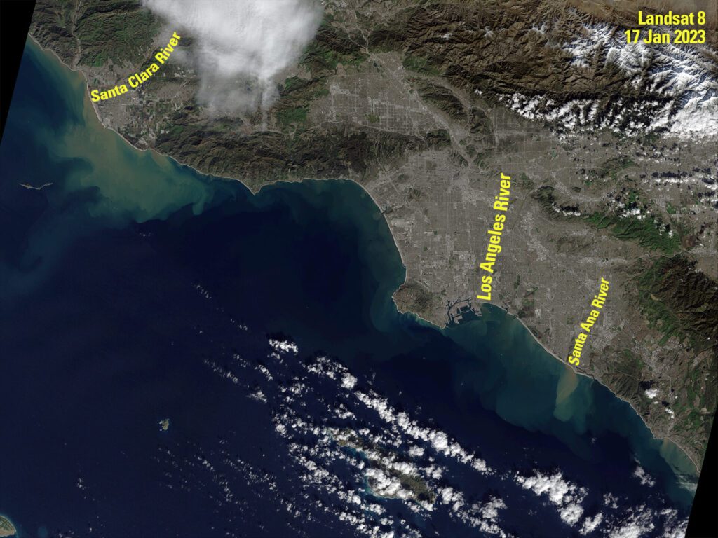 This image taken by Landsat 8 in January shows sediment plumes along the coast of California from rivers and creeks after nine rainstorms occurred in a six-week span following three years of drought.