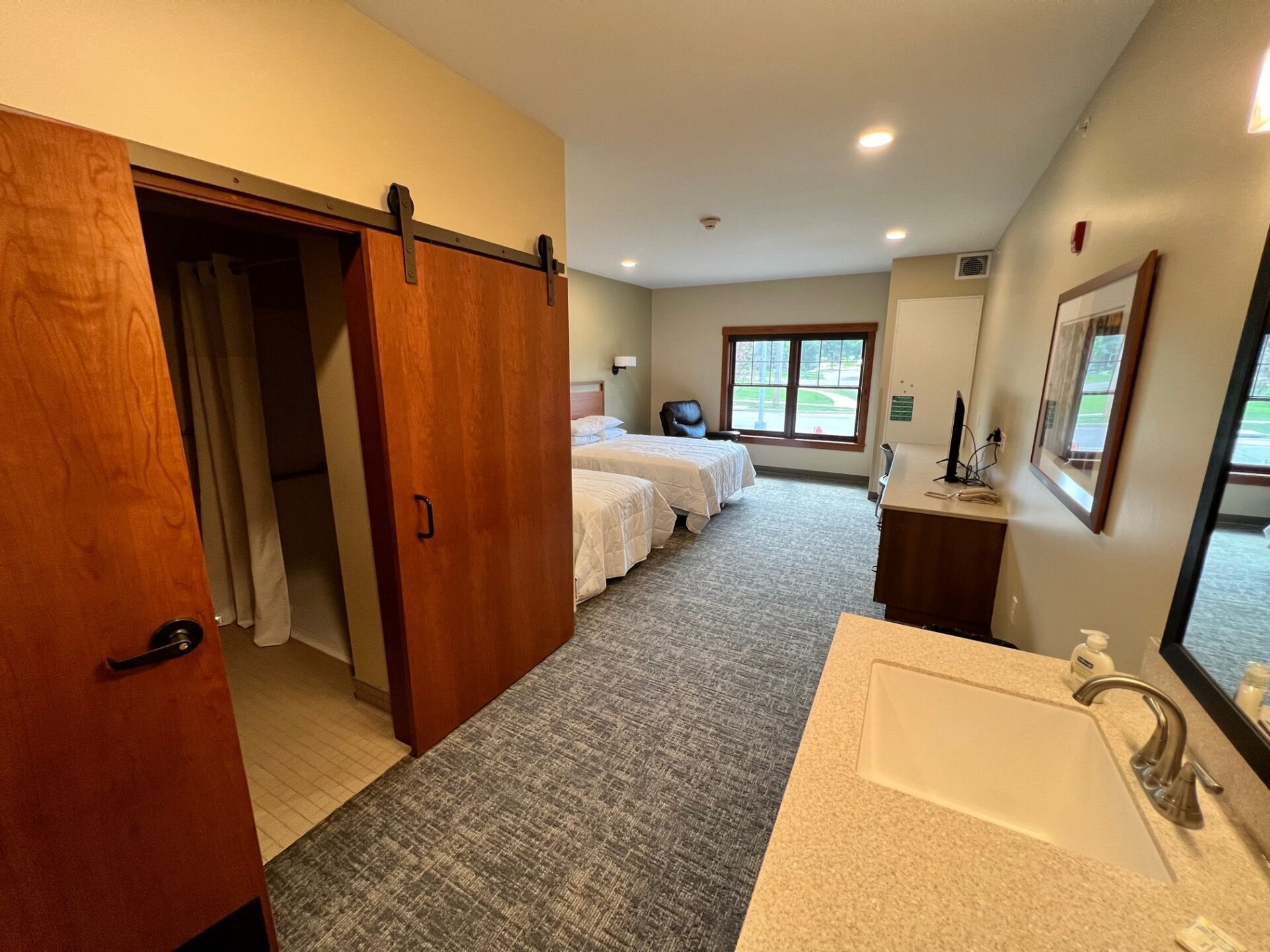 The hotel-like rooms also include other amenities, including refrigerators, TVs, recliners, handicap-accessible bathrooms and spacious closets. Guests have access to shared kitchen and laundry space.