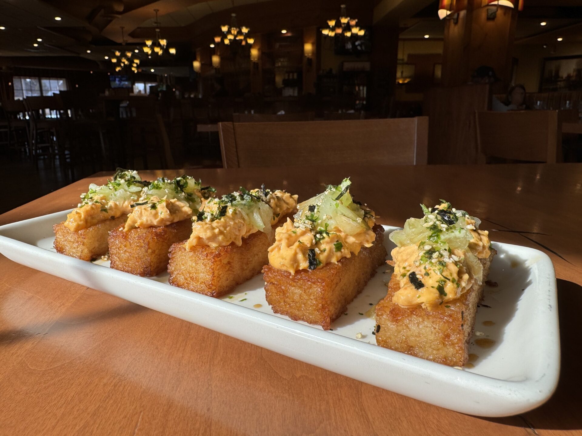 To start, sample the latest appetizer on the menu: crispy rice sushi bites.