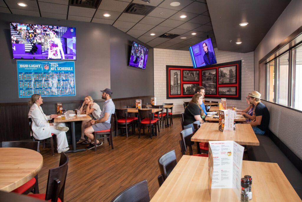 There are about 50 TVs throughout the main dining room, which seats about 100 customers, and in the “team room,” which seats about 50 people and can be reserved for traveling sports teams or other groups.