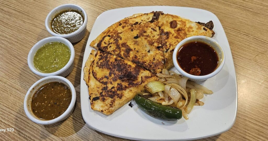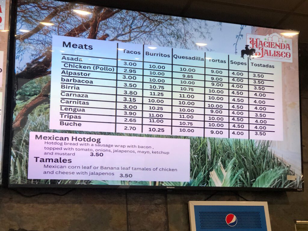 Customers, who order at the counter, can look at the large electronic menu board and see the 10 meat choices and the prices for each option: tacos, burritos, quesadillas, tortas, sopes and tostadas.