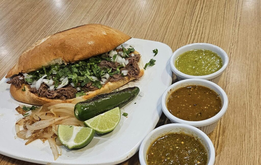 The menu features traditional sandwiches from Jalisco such as torta ahogada and lonches de pierna. There’s also pozole, a soup made with hominy and pork.