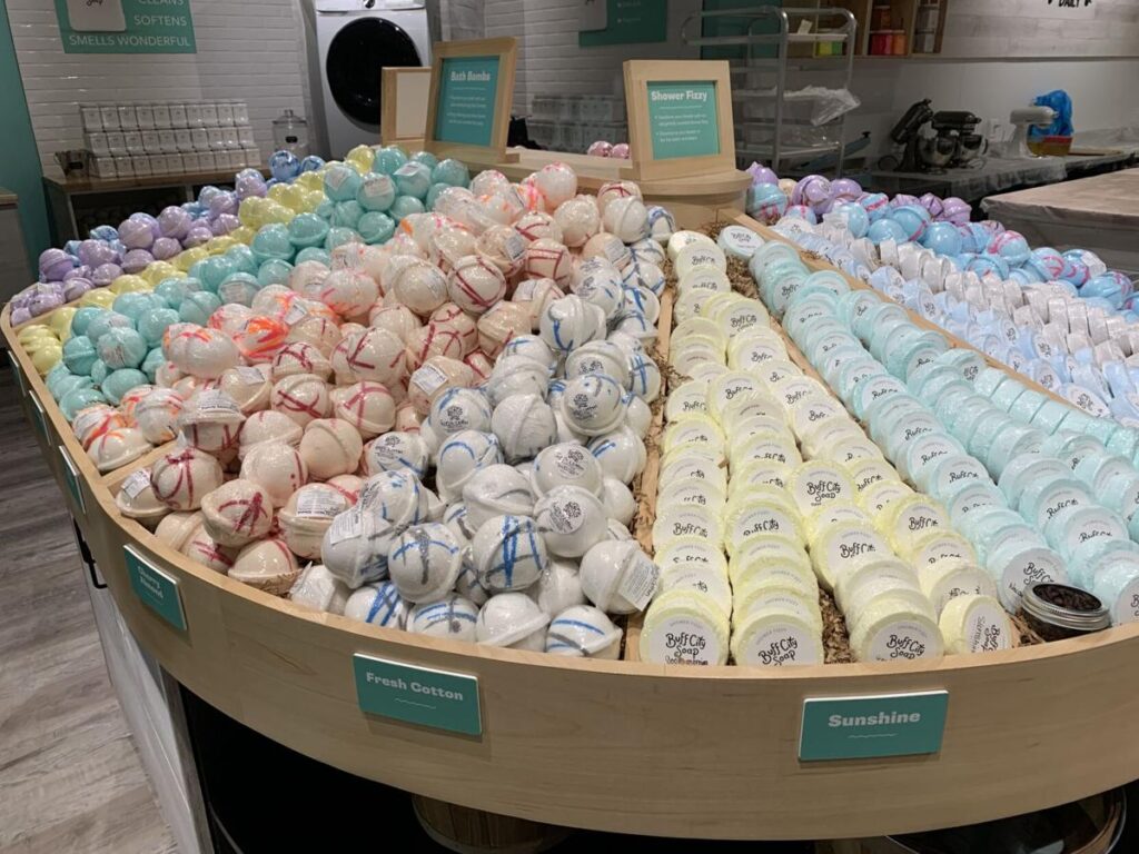 There are more than 30 unique and customizable scents for the products, and “we don’t ship anything in,” Bowen continued. “We just get the natural ingredients sent in. We have a makery, and in there we hand make everything, and it’s an awesome experience to be part of and see.”