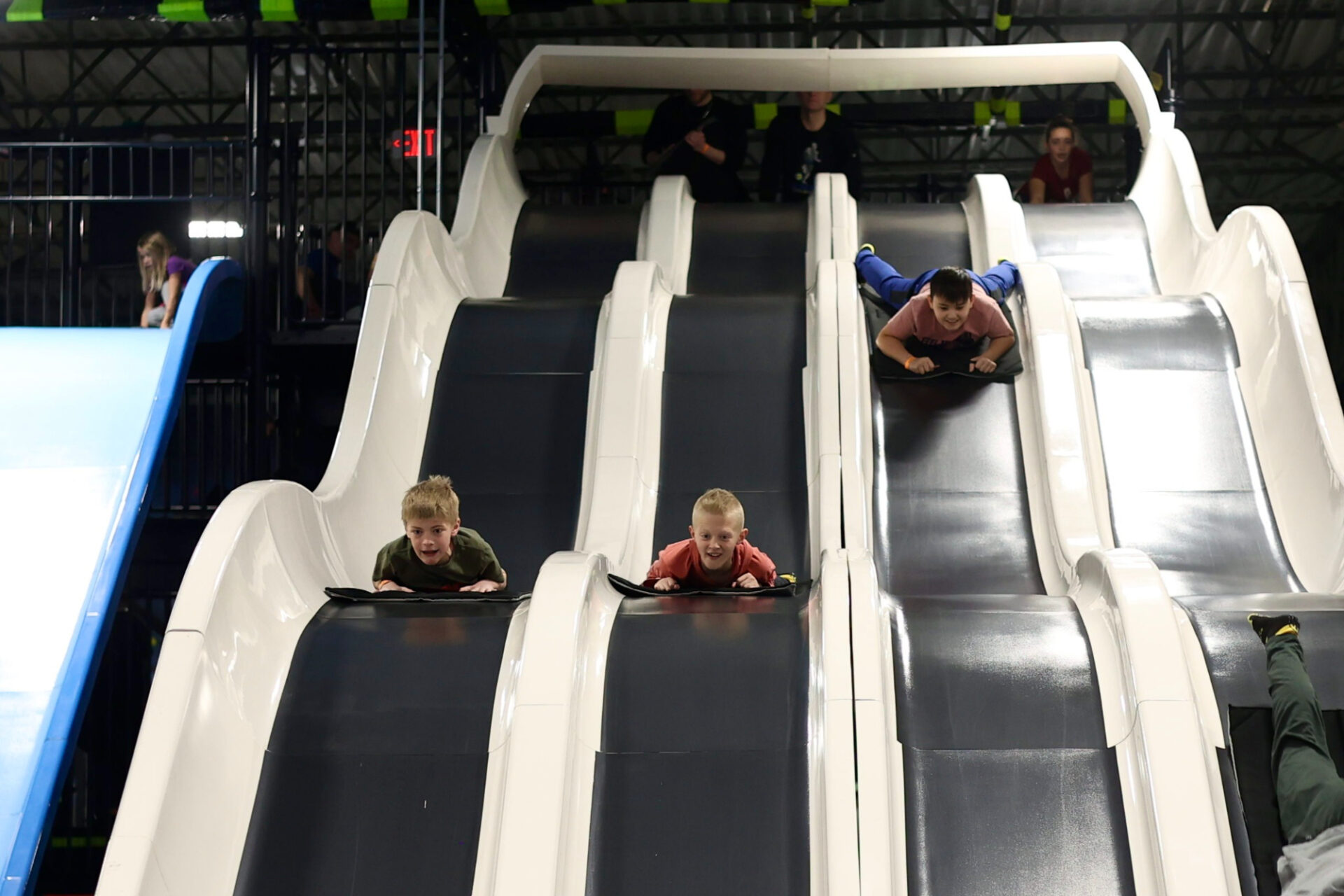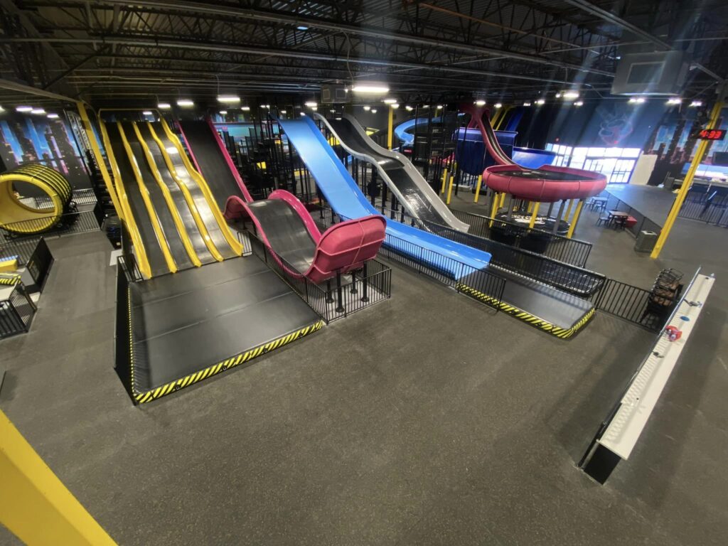 The slides vary from traditional to twisting, including slides that launch riders onto a crash mat.
