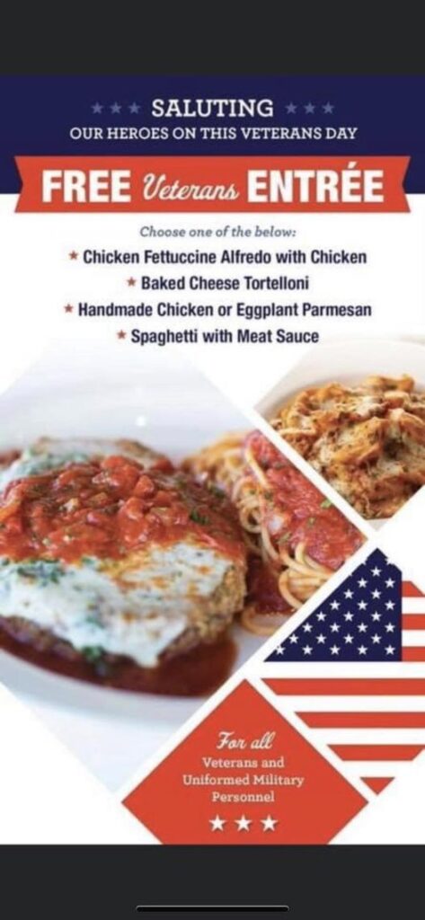 - Carino’s: Free entree – pick from four options – for veterans and active-duty military. Dine-in only.