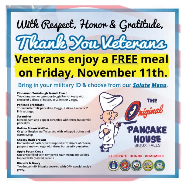 - The Original Pancake House: Free entree for veterans from the Salute menu.