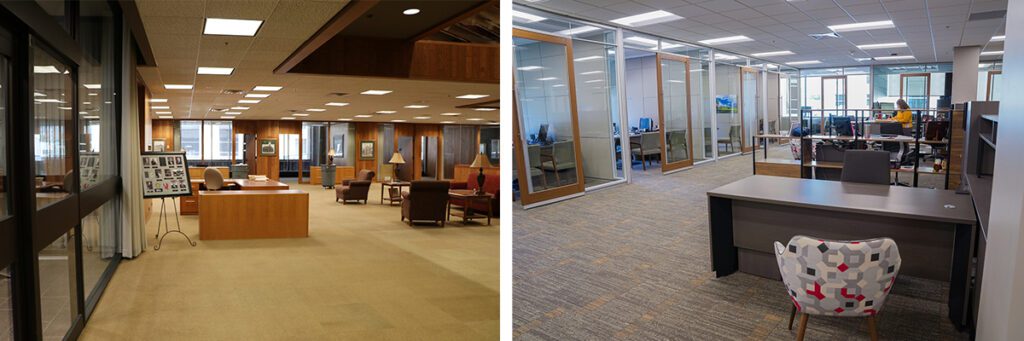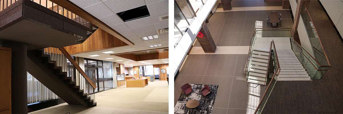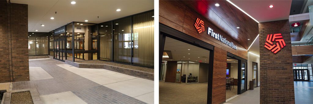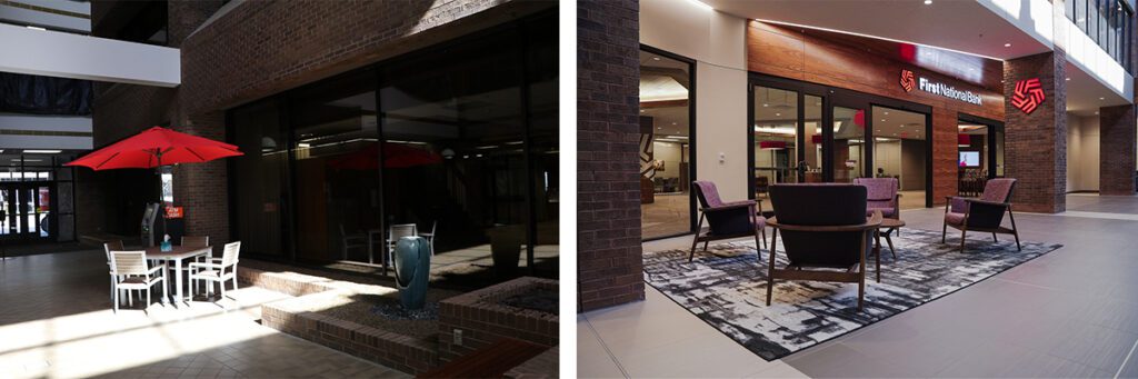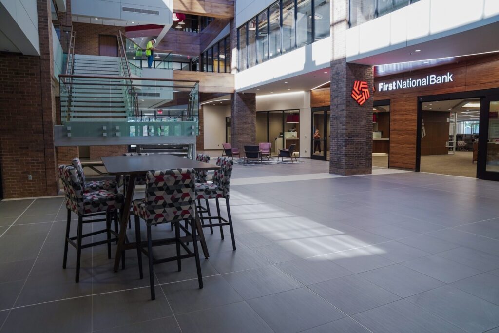 FNB’s facilities team focused on three main priorities for the remodel: recapturing valuable office space, consolidating the five entrances for the building into two, and updating and modernizing the overall look of the first floor and atrium.