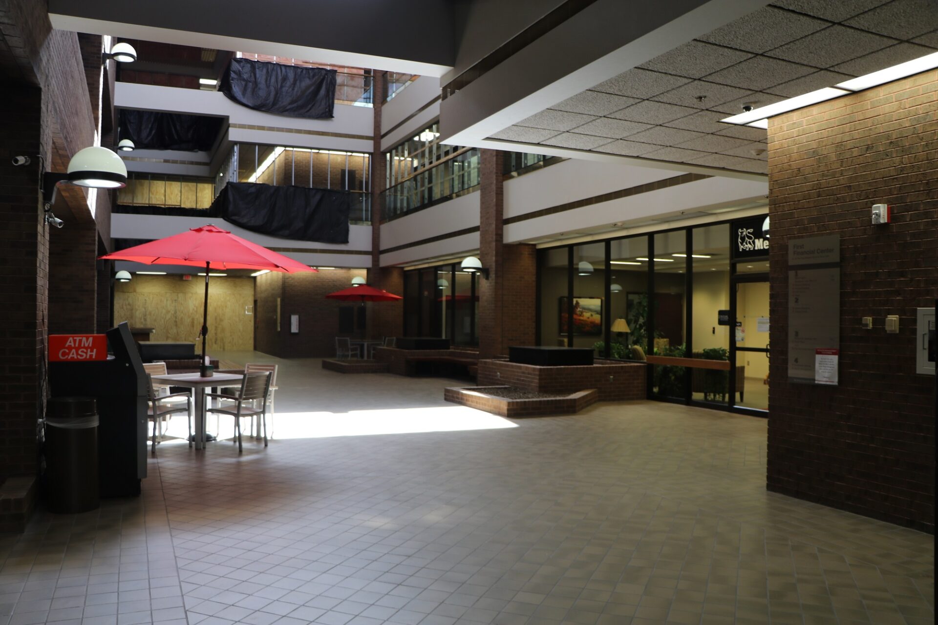 An atrium was added between the two, connecting the buildings and encasing the remains of the pedestrian mall that stood between them — including concrete flooring in the west entrance, brick planters throughout the atrium and outdoor furniture complete with patio umbrellas.